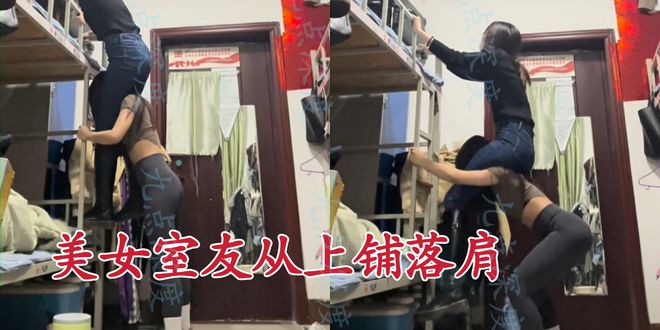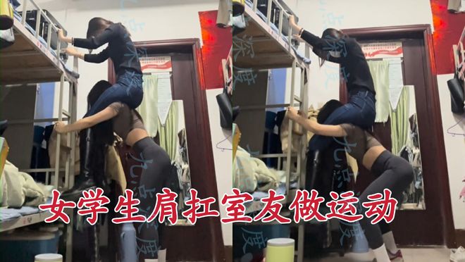 在开始下蹲之前,身穿牛仔裤的美女室友先是爬到上铺,然后瑜伽裤女子则身体靠近床铺,让牛仔裤美女从上铺坐到自己肩上。