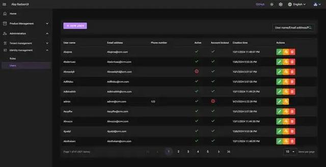 个人感觉不太美观,于是网上搜了很多Blazor开源组件库,发现有一款样式非常不错的组件库,名叫:Radzen,它的组件库案例网址是:https://blazor.radzen.com/dashboard?theme=material3-dark,比较符合我的审美,于是使用它开发了基于ABP框架的UI主题,项目名称叫Abp.RadzenUI,已在Github上开源:https://github.com/ShaoHans/Abp.RadzenUI,欢迎大家star。已经提供了基本的功能:登录(支持多租户)、角色管理、用户管理、权限分配、租户管理、多语言切换、免费主题样式切换、侧边栏菜单等;