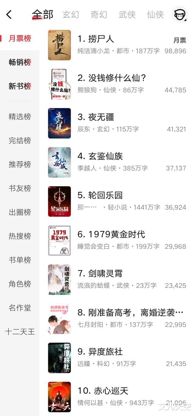 熊狼狗的《没钱修什么仙?》进入主角筑基反压迫的一个高潮剧情,目前也正在进行,月票涨幅加快,反超了《夜无疆》从第三到了第二。