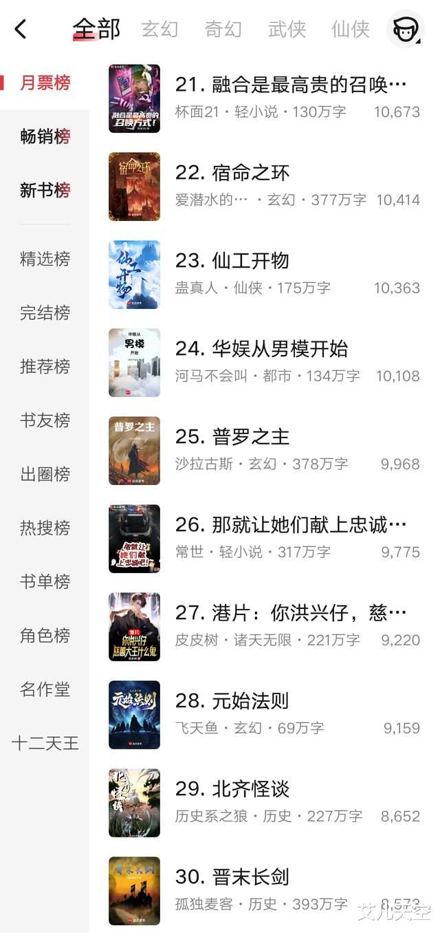 乌贼的《诡秘之主》依旧还是三十几起步,本月或许依旧能维持在前五十,确实稳得吓人,毕竟还有不到两个月就完结快五周年了。完结这么久还能这个名次,仅此一本了。