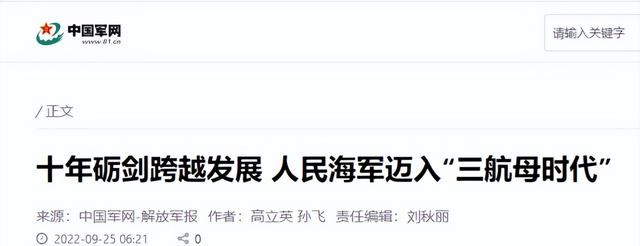 中国军网 2022-09-25《十年砺剑跨越发展 人民海军迈入“三航母时代”》