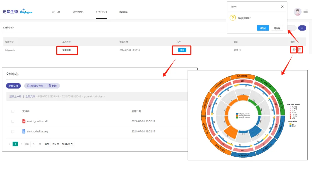 上一步说到提交后的界面会跳转到“分析中心”。没错,分析中心是任务进度的体现,主要展示了任务名称、工具名称、任务时间、任务状态等信息。其中,点击查看,界面跳转文件中心,小工具分析所产生的所有文件都储存在对应的文件夹中,同时还提供结果下载;状态栏,显示任务完成与否;“眼睛”按钮,点击之后界面跳转到任务结果展示界面,可实时查看任务结果图(这里主要指的是该小工具会产生结果图),并提供两种结果图的下载方式;“删除”按钮,选择是否删除该任务。若您对当前参数生成的结果图不满意,还可以在工具名称栏,点击小工具名称,即可重新输入文件、调整参数运行小工具。