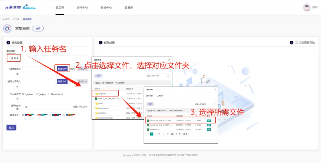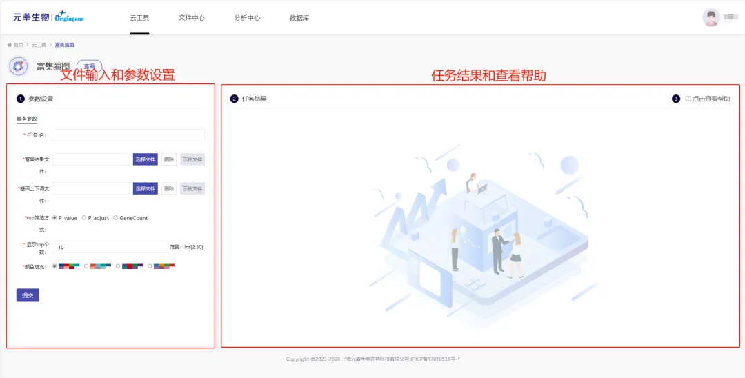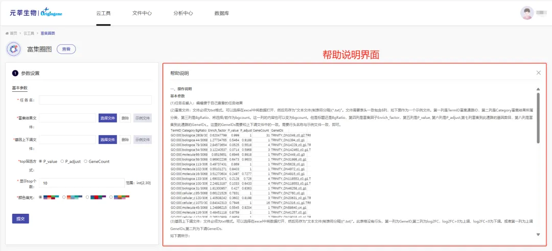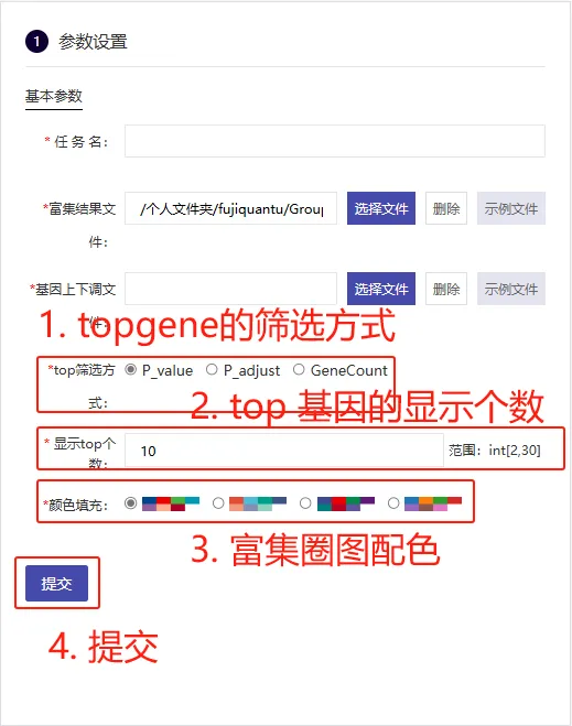 2. 数据文件上传完成之后,紧接着就是设置参数,可选择top基因的筛选方式、个数以及调整富集圈图的配色。如果不修改参数,使用系统默认参数即可。参数设置完成后,点击提交,界面跳转至“分析中心”,等待运行即可。