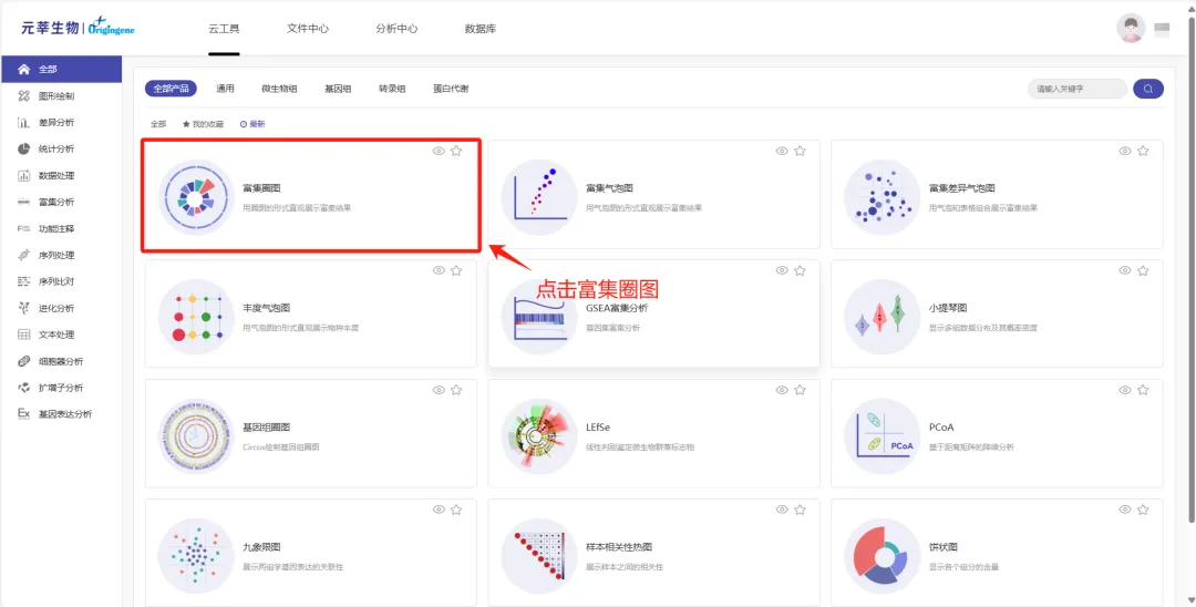 1. 登录元莘生物云平台官网:http://cloud.origin-gene.com/(推荐谷歌浏览器打开链接或点击下方查看原文直接跳转),检索富集圈图小工具。
