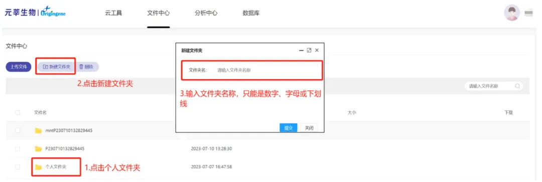 2. 文件准备好之后,接下来是上传文件。云平台提供两种上传文件方式,一种是从“文件中心”上传,另一种是通过“云工具参数-选择文件-上传文件”上传。在这里,我们选择通过“文件中心”上传文件进行演示。具体操作步骤如下:点击文件中心,找到个人文件夹,在个人文件夹目录下新建文件夹,然后点击提交即可。需要注意的是,这里不能直接在根目录下选择新建文件夹。