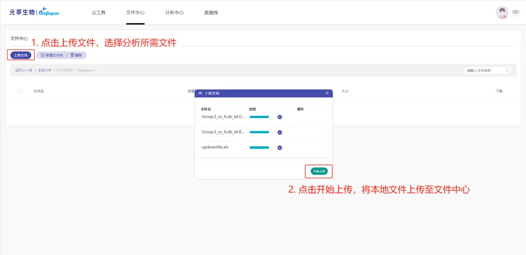 3. 继上一步新建文件夹后,开始上传文件。具体操作如下:点击文件夹,然后点击上传文件,选择对应的文件,点击开始上传即可。