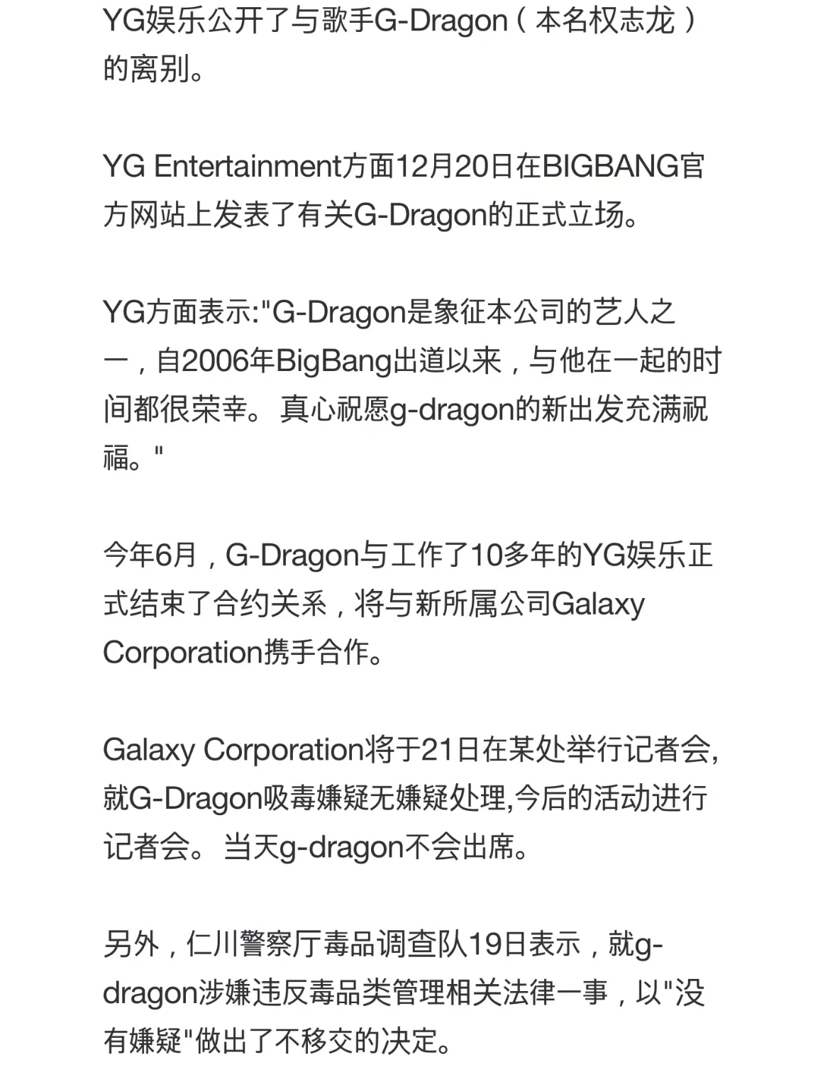 今日,YG娱乐通过BigBang官方网站回应网传权志龙或将重回YG一事,表示:“权志龙是象征本公司的艺人之一,自2006年BigBang出道以来,与他在一起的时间都很荣幸。”接着,YG补充道:“真心祝愿权志龙的新出发充满祝福”,正式确认与权志龙不再续约。 公司对权志龙的决定表示尊重,并衷心祝愿他在未来的道路上能够一帆风顺,开创出全新的篇章。