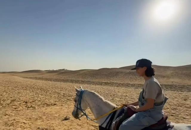 从画面中可以看到,诺一身穿蓝色短袖T恤坐在马鞍上,看着妹妹霓娜在金字塔下骑马奔驰。
