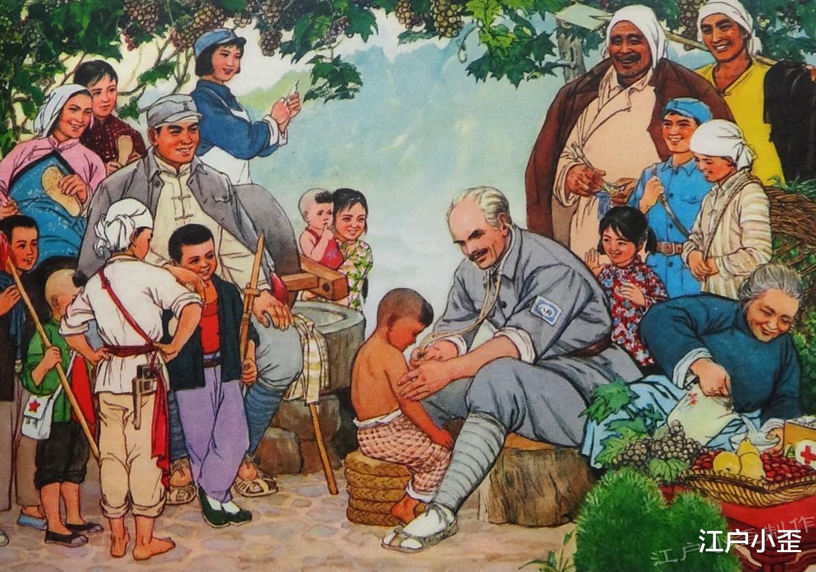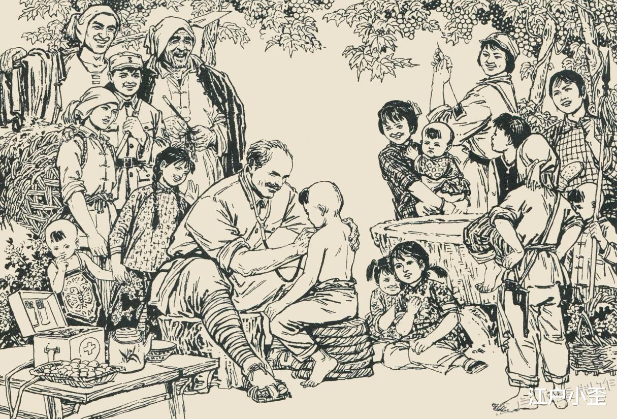 这是本书的门面,宣传时总拿这幅作文章。白求恩笑眯眯地给孩子听诊,除了那个阿福头的婴儿,所有人都在笑。军民一家亲,其乐融融。