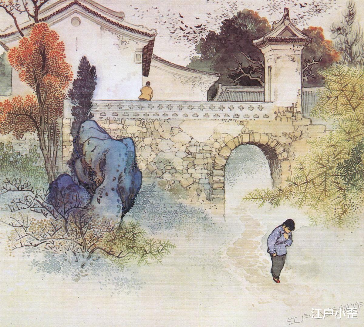 这是一则独角戏,落榜文人垂头丧气,走在江南水乡拱桥之上,形单影只,很寂寥。