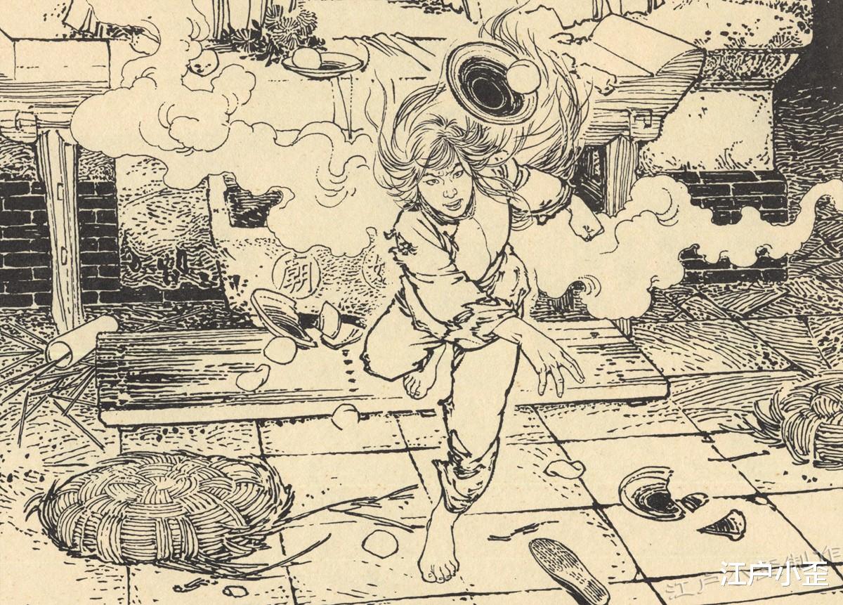 白毛仙姑面向读者扔果盆,很有冲击力。这是白毛女对黑暗世界的控诉,她的愤怒直接触动了读者。