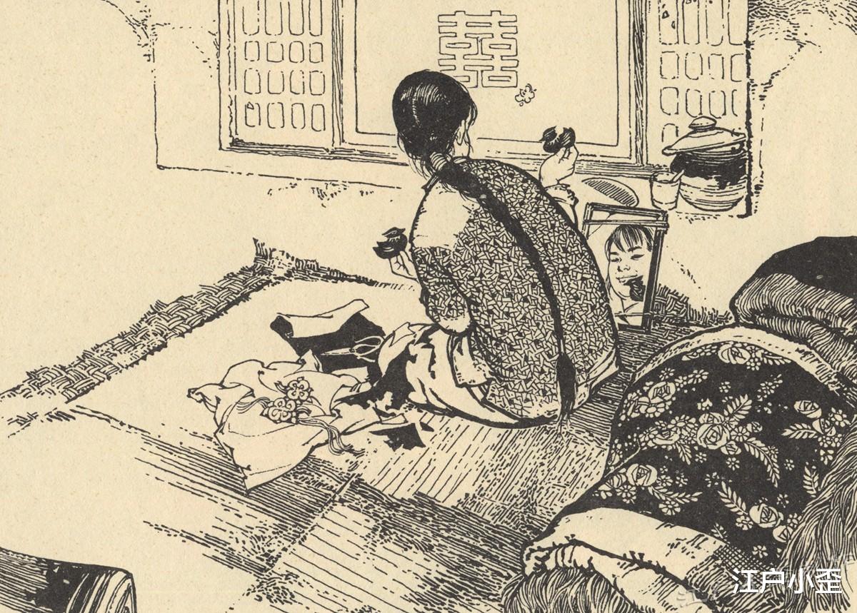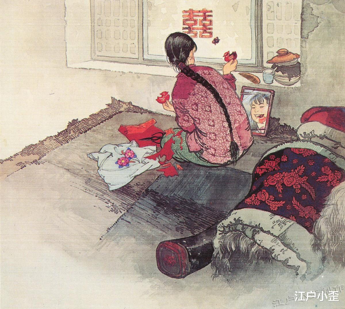 扯起三尺红头绳,自己扎起来。喜儿要出嫁了,手里托着两只鸳鸯,镜子中的她是多么欢乐,就是下巴上肉有点多,看来营养还不错。