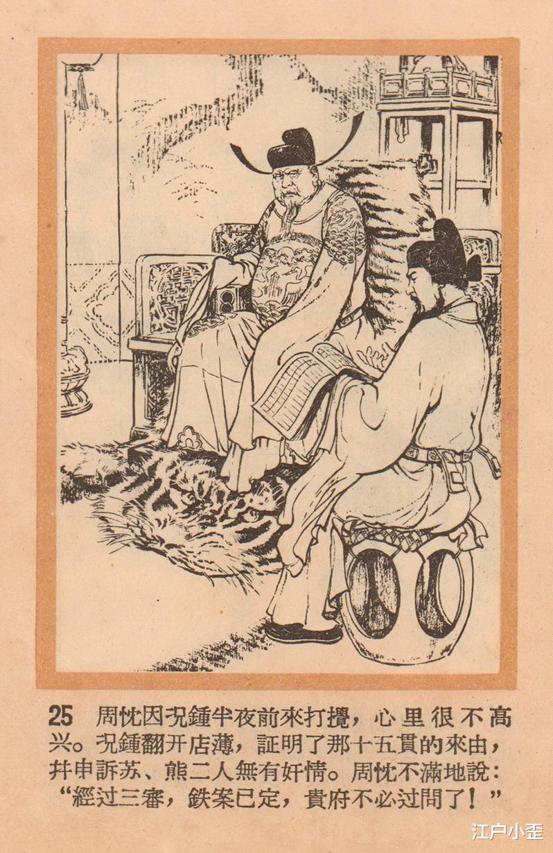 1.《十五贯》 画家:王弘力《十五贯》连环画创作于1956年,改编自同名昆剧。根据画家王弘力回忆:接到绘画任务时没看过剧,只翻了剧本,他立刻想到这是明末小说《双熊梦》改编的,只不过把双线冤情收束到了单线。