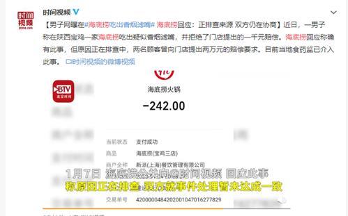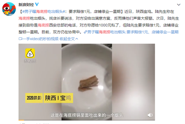 经济日报-中国经济网北京1月7日讯 综合视频网站“梨视频”、“时间视频”消息,有消费者近日在位于陕西宝鸡的海底捞就餐时,吃出疑似烟头物质。相关视频内容显示,该消费者在吃出不明物质后拒绝了海底捞提出的赔偿金额,但要求海底捞相关店铺停业整顿一周未果。