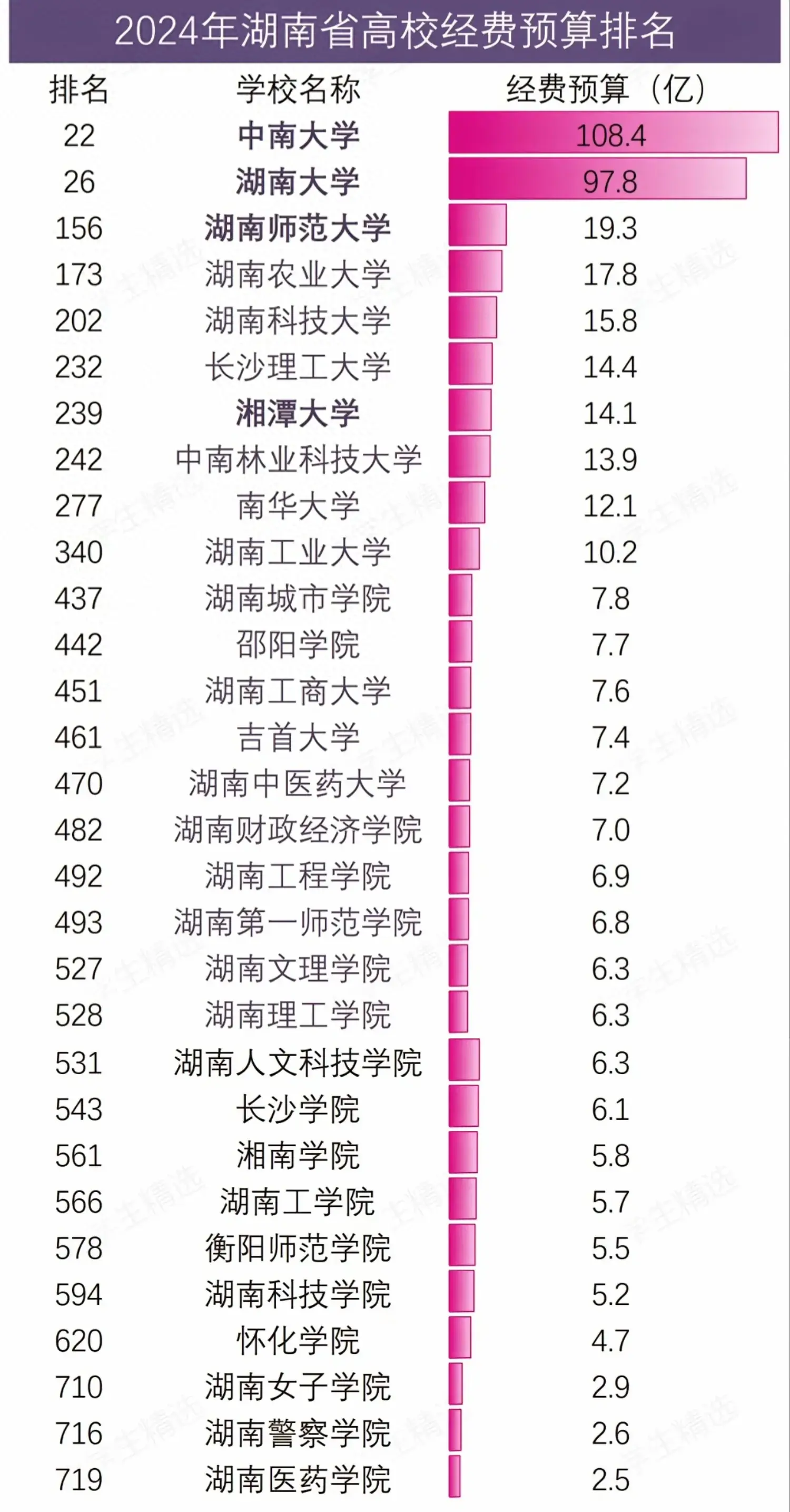 2024 年有 14 所高校经费预算增长速度都超过 10%,这说明湖南省对高等教育发展的重视,在有限的财政资源下,积极加大对高校的投入。