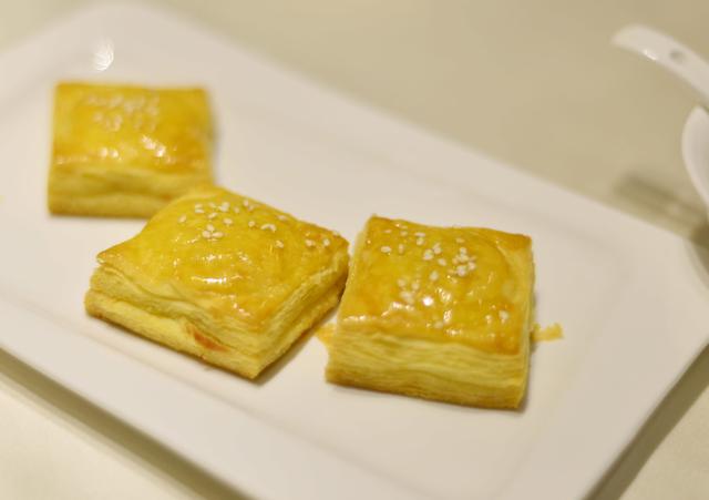 如图:金黄诱人的榴莲酥以新鲜榴莲果肉配制的软滑馅心,配以层次分明、异常松化、做工精细的酥皮,令人食指大动。