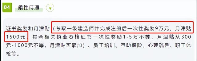 以某北京工程局一公司发布的校招为例,考取一级建造师并完成注册后一次性奖励9万元,月津贴1500元。