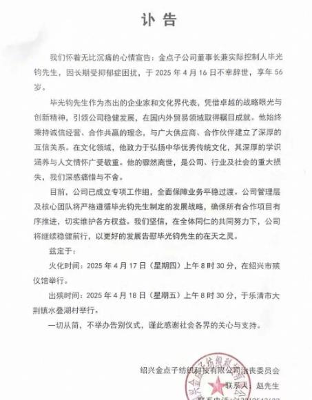 2025年4月16日,绍兴金点子纺织科技有限公司发布讣告称:本公司董事长兼实际控制人毕光钧先生因长期受自闭症困扰,不幸辞世,年仅56岁。