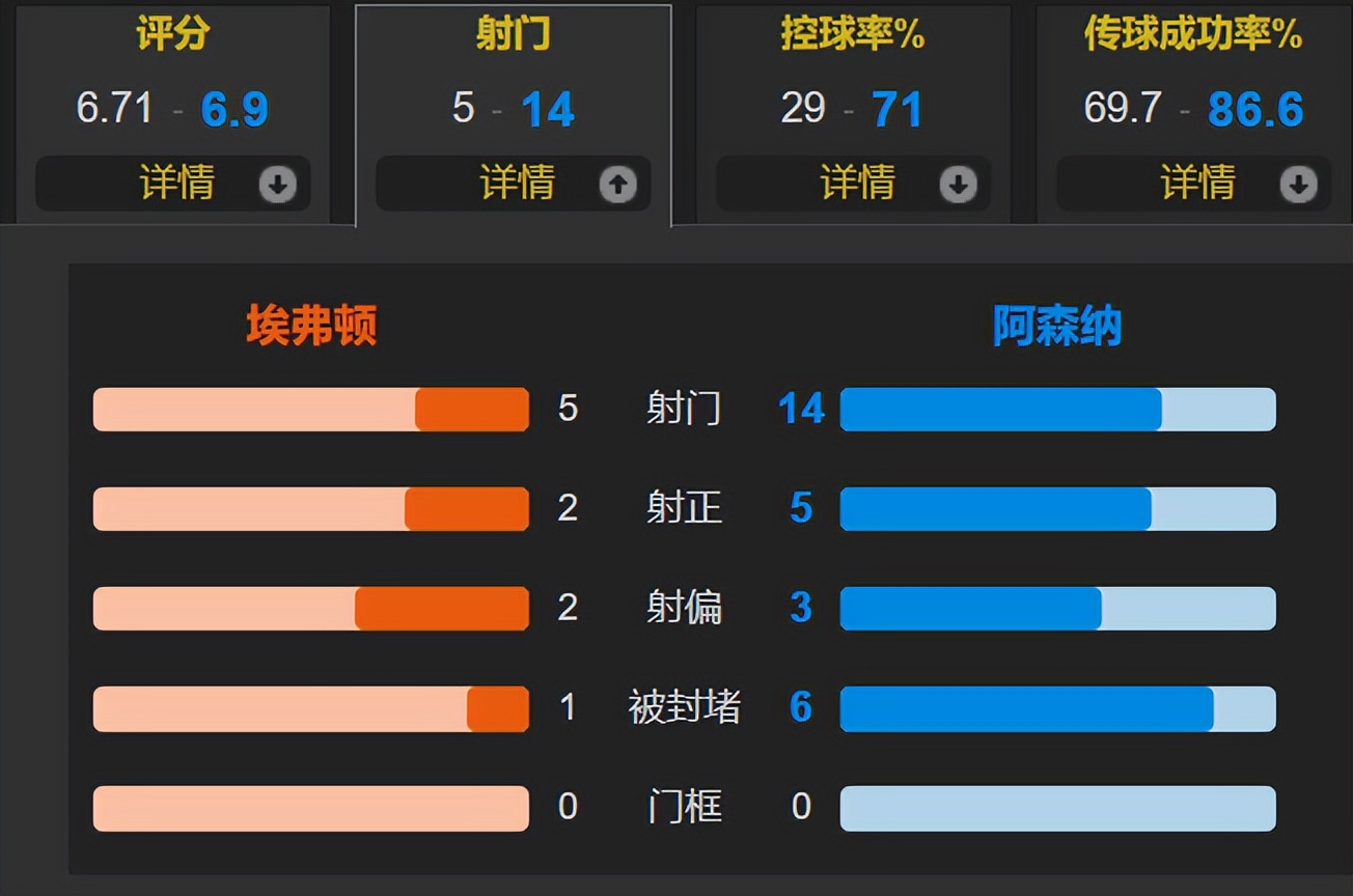 全场比赛,埃弗顿的控球率仅有29%,一共有5次射门,其中2次射正;阿森纳一共有14次射门,其中5次射正。