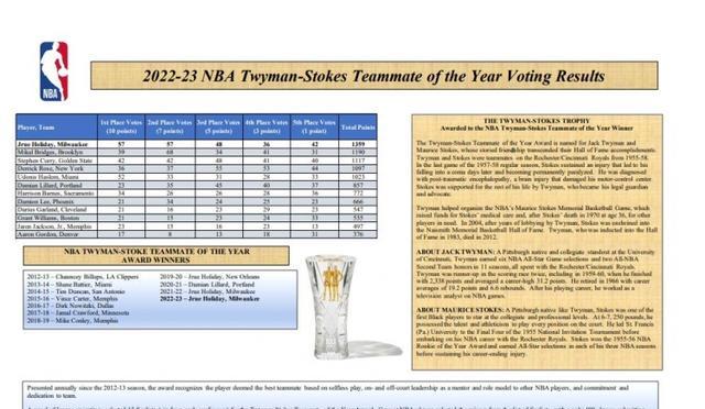 6~10位分别是利拉德,哈里森巴恩斯,达米恩李,加兰德以及格兰特威廉姆斯,另外小贾伦杰克逊和戈登也登上了榜单。这是联盟评选出来的那些年度最佳队友奖,上榜的人有这个奖项,说明你的队友认可你,尊重你,承认你为这支球队做出的贡献,更重要的是承认你在这个球队的地位,而且承认你是个好队友,这不是更衣室的那些客套话,这是实打实选出来的。