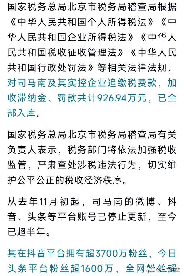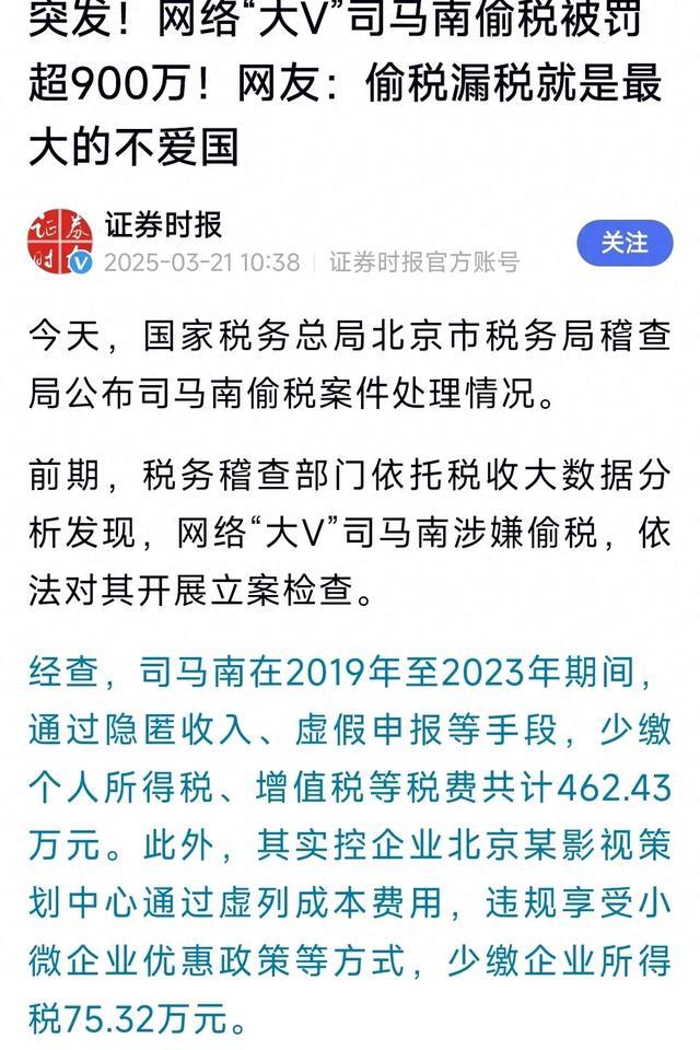那么司马南算真爱国,还是假爱国?这一次国家税务总局动了真格的,查出他通过各种手段少交了税费竟然高达462.43万元,这数字有零有整,极具权威性。他所控制的一个小企业也少交税75.32万元。司马南在人们中的形象一夜崩塌,未来他在视频上侃侃而谈的时候,谁还会相信他说的话!难道他义正词严说出的话只是为了吸引流量?只是为了博得广大网友的好感?
