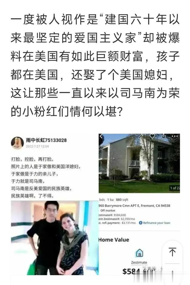 这不自己打自己脸吗?说得比唱得好听,司马南在今日头条和其他网络上慷慨陈词,对一些不合理的现象义愤填膺,许多人夸赞司马南,贴近百姓,说出了人民的心声。但是前一阵子有人发现他在美国有别墅,于是就有人提出他“口头爱国,实际上是爱美国”,后来有人认为这是蓄意污蔑,此事不了了之,但也有人深挖,挖出了实情,他在美国拥有巨额财产,而且儿子和妻子在美国过着挥金如土的生活,他儿子还找了个美国媳妇,有照片为证。