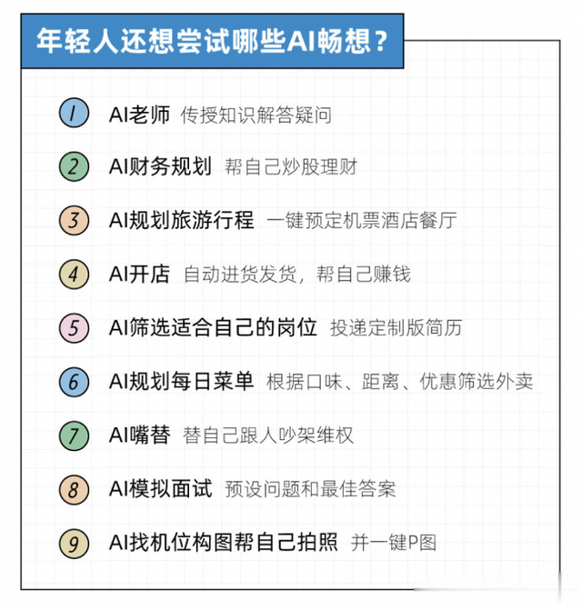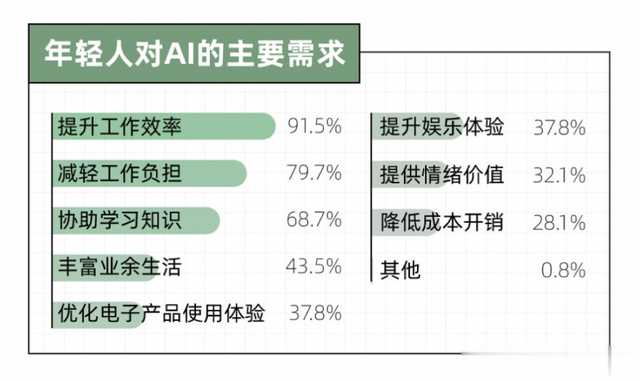 年轻人还期待AI做点啥年轻人对AI的期待: 期待AI能提供教学、财务规划、旅游规划等更多功能。