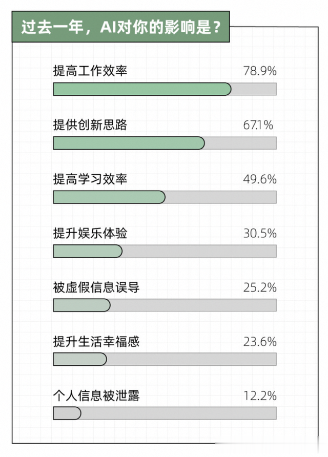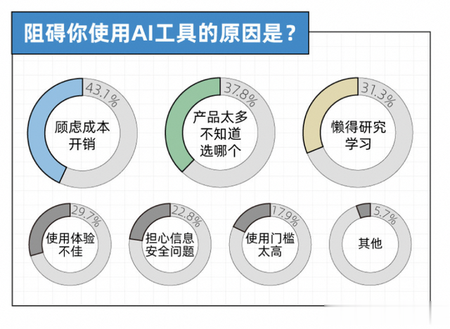AI带来的挑战与机遇尽管AI带来了许多便利,但也存在一些挑战。报告中指出,"79.7%的年轻人认为AI提升了工作效率和减轻了负担",但同时也有"43.1%的年轻人选择了‘成本开销大’"作为使用AI的障碍。