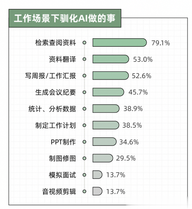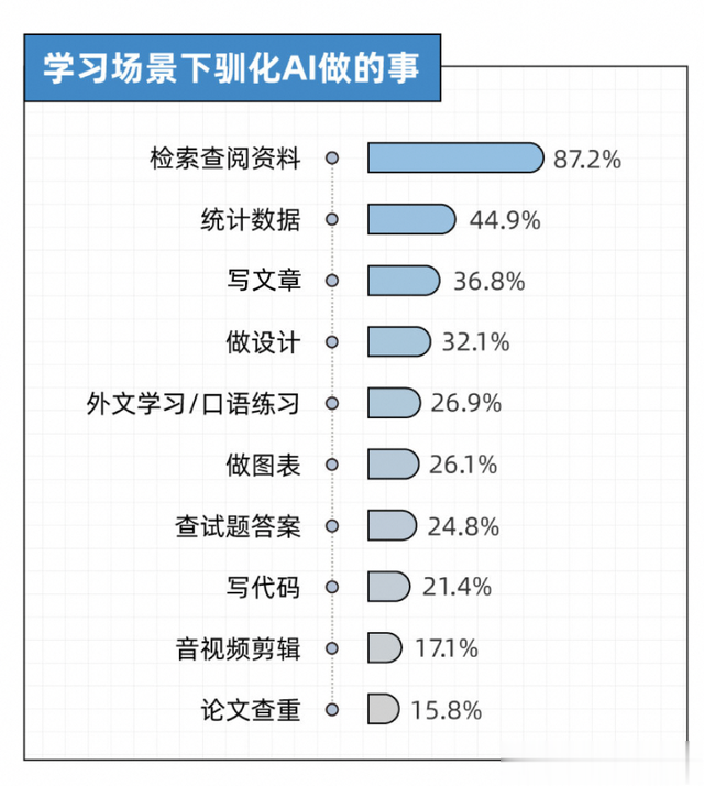 从模拟困试到健身指导,没有什么AI做不到在学习过程中,年轻人最常用的是用AI检索资料,其次是统计数据。