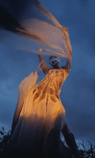 不得不说,这个女战神的造型真的很赞,把未来科幻和战斗暴力的美学完全糅合在一起,头戴金属面罩,右手执长剑,左手握光书,身着有金属光泽的黑白渐变长裙。
