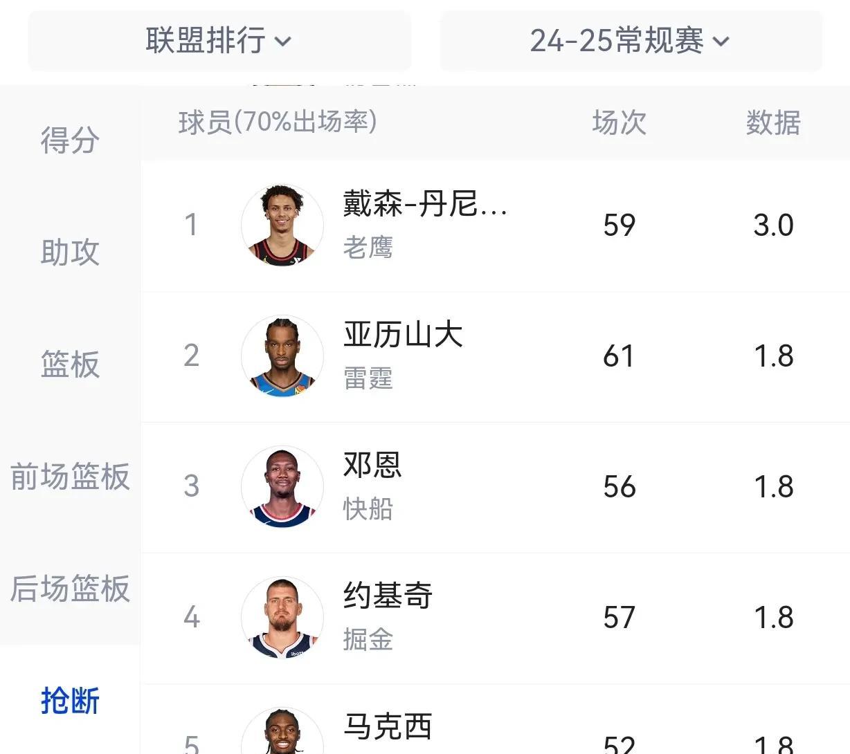 说起一防的竞争,邓恩可是有个劲敌啊,那就是老鹰队的丹尼尔斯。这哥们儿现在场均3.0次抢断,领跑全联盟呢。两个人的数据看起来差不多,但是风格却很不一样。丹尼尔斯可能更全面一些,进攻端的贡献也不小。而邓恩就是个纯防守专家,进攻基本上就是打酱油。