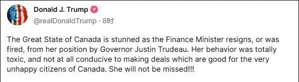 就在最近加拿大副总理辞职一事上,特朗普似乎也特别钟情于“州长”这一称呼。