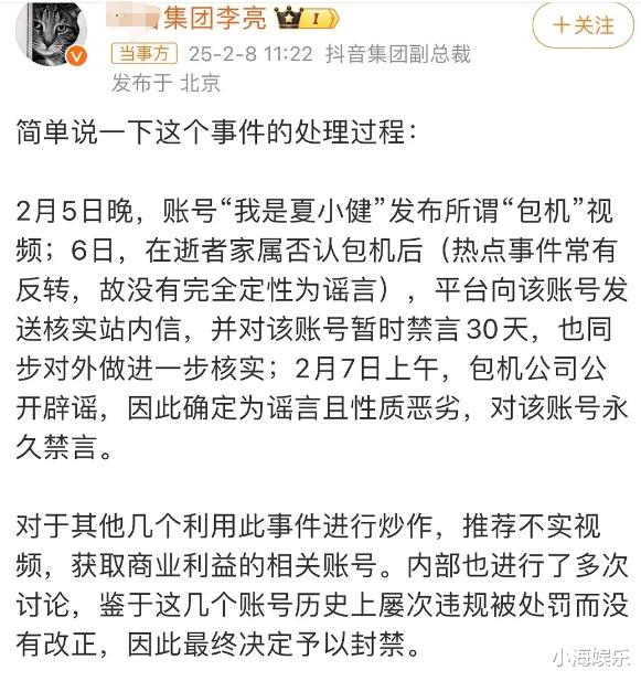李亮解释称封禁夏小健的原因是其发布不实信息,误导公众。其5日发布所谓“包机”视频,6日家属否认包机,但热点事件常有反转,所以只对其禁言30天,直到包机公司发布声明,才确认其是谣言且性质恶劣,故对其永久封禁。