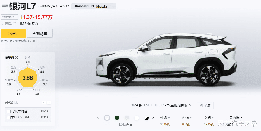 相比之下,吉利银河L7 EM-i作为比亚迪宋PLUS DM的直接竞品,新车在价格上会有明显的优势,只不过并没有像比亚迪一样,全系标配三目摄像头的天神之眼C高阶智驾系统。但需要注意的是,此次吉利银河L7 EM-i的入门版就有115公里的纯电续航,而且结合11.58万元的起步价,同样有着不小的产品竞争力。所以说到这里,接下来我们就针对11.58万元起步的2025款银河L7,看看它的产品实力如何。