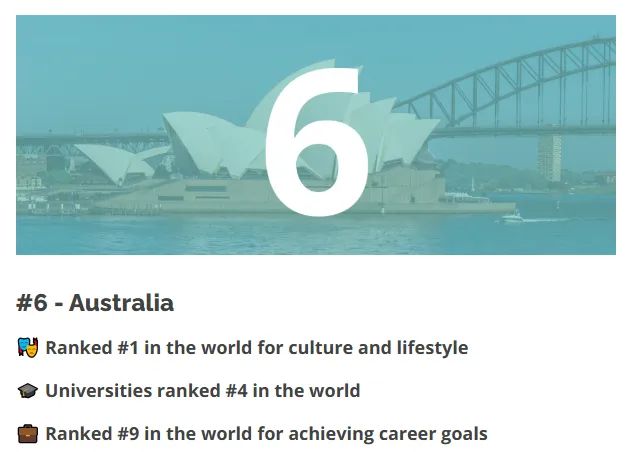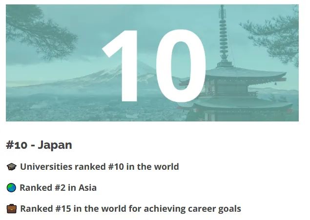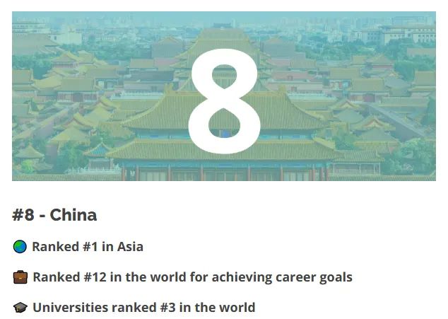 ”在今年的榜单中,英美仍然占据上风,但是美国拿到榜首,英国屈居第二。值得关注的是,中国在今年首次入榜全球十佳留学国,并且位列第8位,亚洲第一☝️