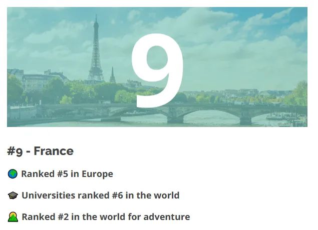 法国拥有众多世界闻名的高等教育机构,如巴黎综合理工学院、巴黎索邦大学、巴黎政治学院等,这些学校在科学、技术、艺术、社会科学等多个领域都提供了高质量的教育项目。相比去年,法国今年虽然下降了5位,但它仍然深受艺术、历史和时尚专业的学生喜爱。