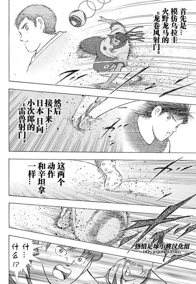 先由日向小志强射出雷兽射球,然后大空翼和岬太郎在球飞行轨迹的途中同时施展由雷兽射球踢在球上,把三人的力量叠加到一起。