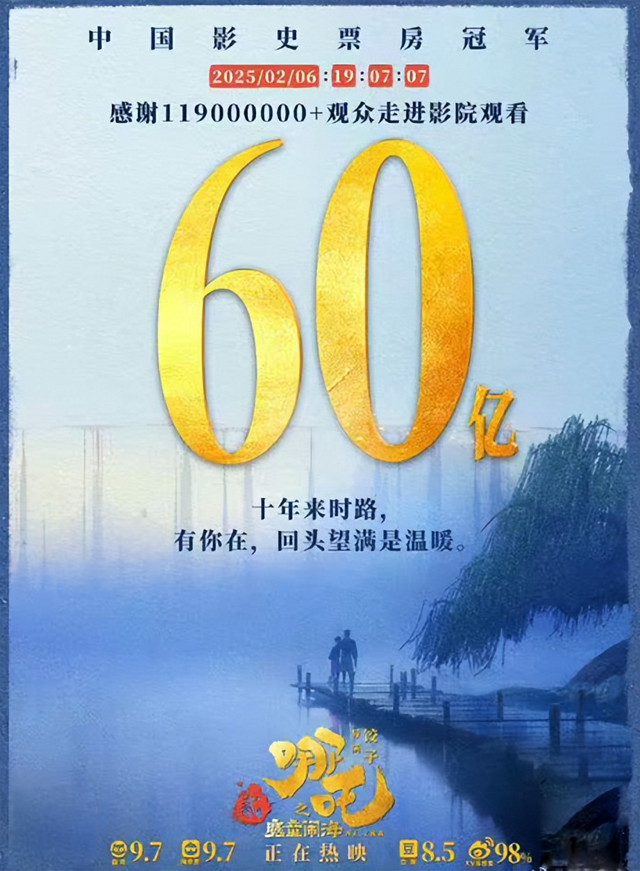 《哪吒2》打破了《长津湖》保持四年的57亿票房记录,登顶中国影史票房排行榜。而后又以惊人的势头冲破了60亿票房大关。