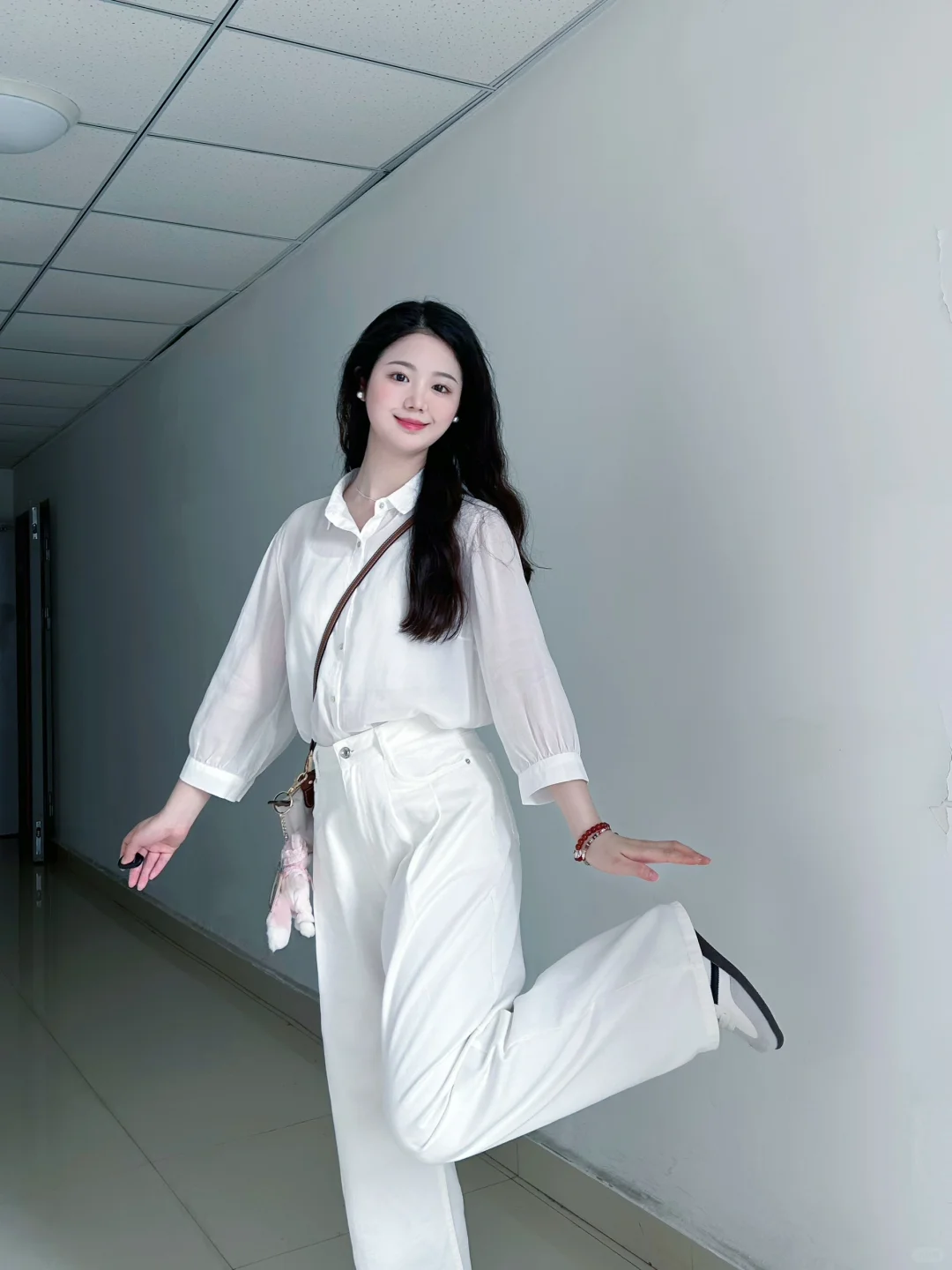 不过,白色有膨胀的特征,对于腿粗的女性来说,选择太紧身的设计容易暴露身材瑕疵。此时,衬衫与白色阔腿裤的组合就是最佳选择。阔腿裤宽松的裤腿能巧妙地修饰腿部线条,让你看起来优雅又知性。