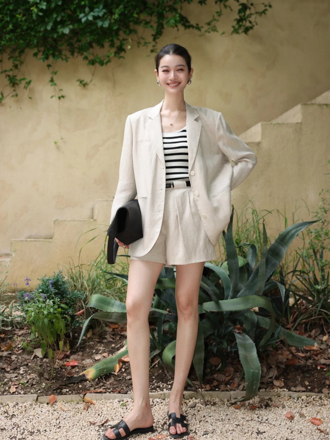当然,如果你喜欢更加慵懒随性的风格,宽松版型的小西装则是不错的选择。宽大的短款西服外套搭配短裤套装,能营造出时髦又摩登的感觉,让你在休闲时光也能轻松成为焦点。