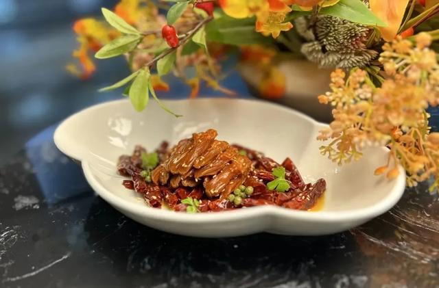 带鱼炸至酥脆,再以自制小料爆炒翻匀,外皮浸入料汁,裹匀脆椒碎,入口滋味丰富,香辣浓郁,内里鲜嫩细腻,非常适合下酒。