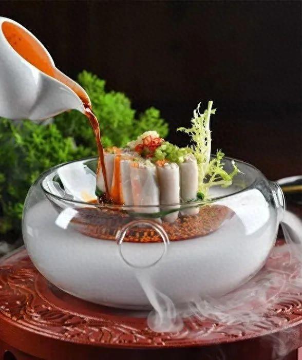 2、盘内放鱼肚250克、果芹丁50克,浇入捞汁110克即可走菜。