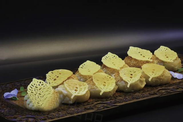 3、取川式小包酥皮料包入馅料,刷匀鸡蛋清,放入加有少量油脂的平底锅,煎约8分钟至熟,铲出来装盘,稍加点缀即成。