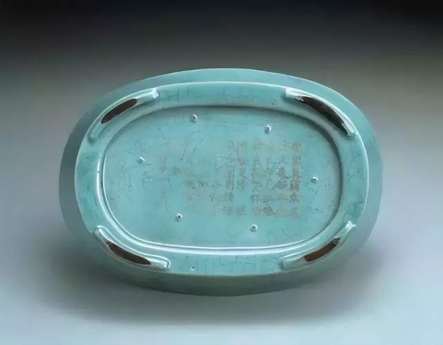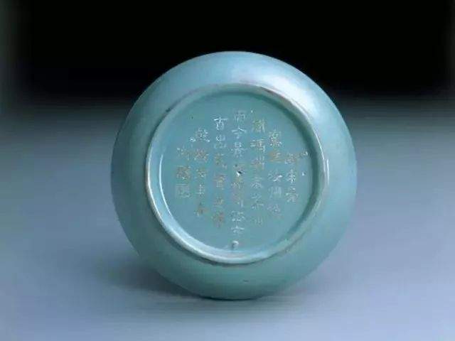 全器满釉不露胎,仅在器底留下六个细小支钉痕。器底刻有乾隆御题一首。明代鉴赏家曹昭在《格古要论》中提到,汝窑瓷器「有蟹爪纹者真,无纹者尤好」。这件水仙盆釉色匀润,通体无文,是传世所见唯一一件没有开片的汝窑瓷器。