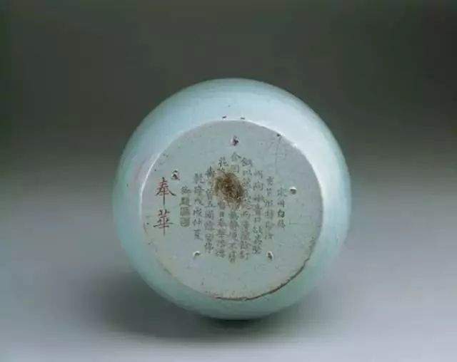 品名:北宋汝窑青瓷奉华纸槌瓶尺寸:高22.4cm 深21.9cm 口径4.4cm 足径8.6cm典藏号:故瓷017856原收藏地:南库底部支钉:5枚传记:圆口、口沿镶铜釦,长颈、折肩、直腹、平底,底部有五点支钉痕,刻有乾隆戊戌年(1778)御题,诗文左侧刻有“奉华”二字。奉华全称奉化堂,是南宋宫室中德寿宫的配殿,也是高宗宠妃刘贵妃的居所,有论者据此推论此件器物即为当时宫廷用器。但此件纸槌瓶但“奉华”款僻据器底一侧,适合刻有避开乾隆御题,所以也有学者认为此件“奉华”款应为后刻。此件作品在1946年参加伦敦中国艺术国际博览会。御制诗:“定州白恶有芒形,特命汝州陶嫩青,口欲其坚铜以锁,底完而旧铁余钉,合因点笔意为静,便不簪花鼻亦馨,当日奉华陪德寿,可曾五国憶留停。”