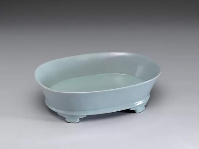 椭圆形盆、突出一圈侈口、深壁、平底、足底间突出一圈窄边稜、四足、足呈云头形。1936年曾参加伦敦中国艺术国际展览会,编号Porcelain No.25。