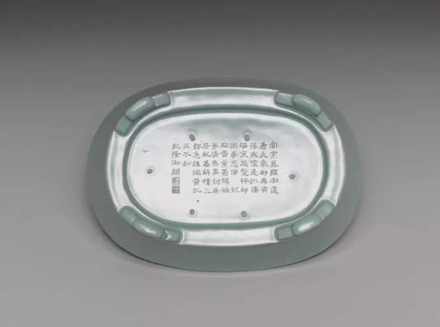 椭圆形盆、侈口、深壁、平底、底足间突出一圈窄边稜,四足,足部可能原与其他水仙盆相同呈云头形,但现已被磨平。器底六个细小制定恒,并刻有乾隆辛巳年(1761)御题一首。诗文内容和其他二件刻有御制诗的水仙盆完全一致,都提及水仙盆传为猧食器,也就是猫食盆的传说。