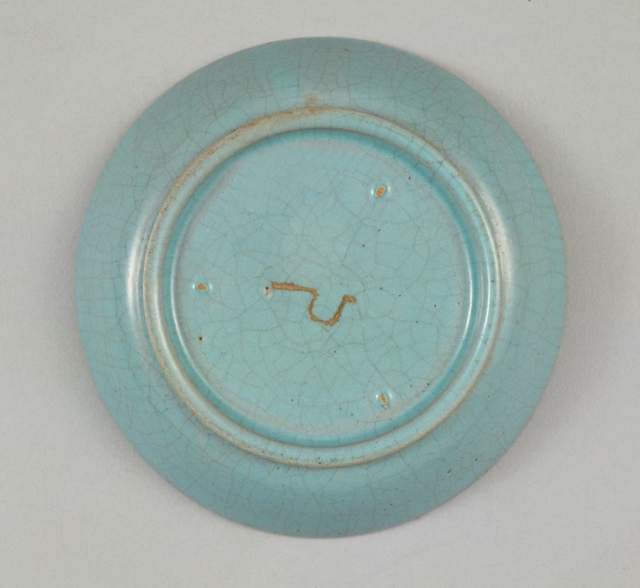 敛圆口、浅壁、壁微呈弧形、平底、无足,底部有三细小支钉痕。这件汝窑青瓷碟,底心郑重刻有“蔡”字,“蔡”字右侧又刻有一篆书“丙”字。二字虽都深入胎内,但刻制工艺明显不同。北京故宫藏有一件青瓷汝窑盘,该器尺寸稍大,器型撇口、弧壁、平底、圈足外撇、器底有五支钉痕,底心同样刻有一楷书“蔡”字。有学者推测这个“蔡”字是物主的姓氏,可能是徽宗时的权丞蔡京,或者是其子驸马蔡鞗的藏品印记。