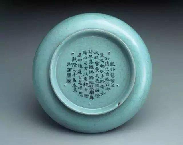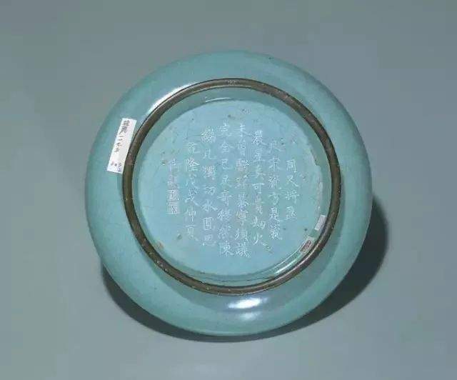 品名:北宋汝窑青瓷盘尺寸:高4.4cm 深2.8cm 口径21.4cm 足径15.5-15.7cm典藏号:故瓷017855原收藏地:古董房底部支钉:5枚传记:敛圆口、浅壁、壁呈弧形、平底、圈足略高且外撇,依足沿痕迹看来,该处原应镶有铜扣,但早已脱落。底部有五支钉痕,并刻有乾隆戊戌年(1778)仲夏,也就是乾隆四十三年五月御题一首。