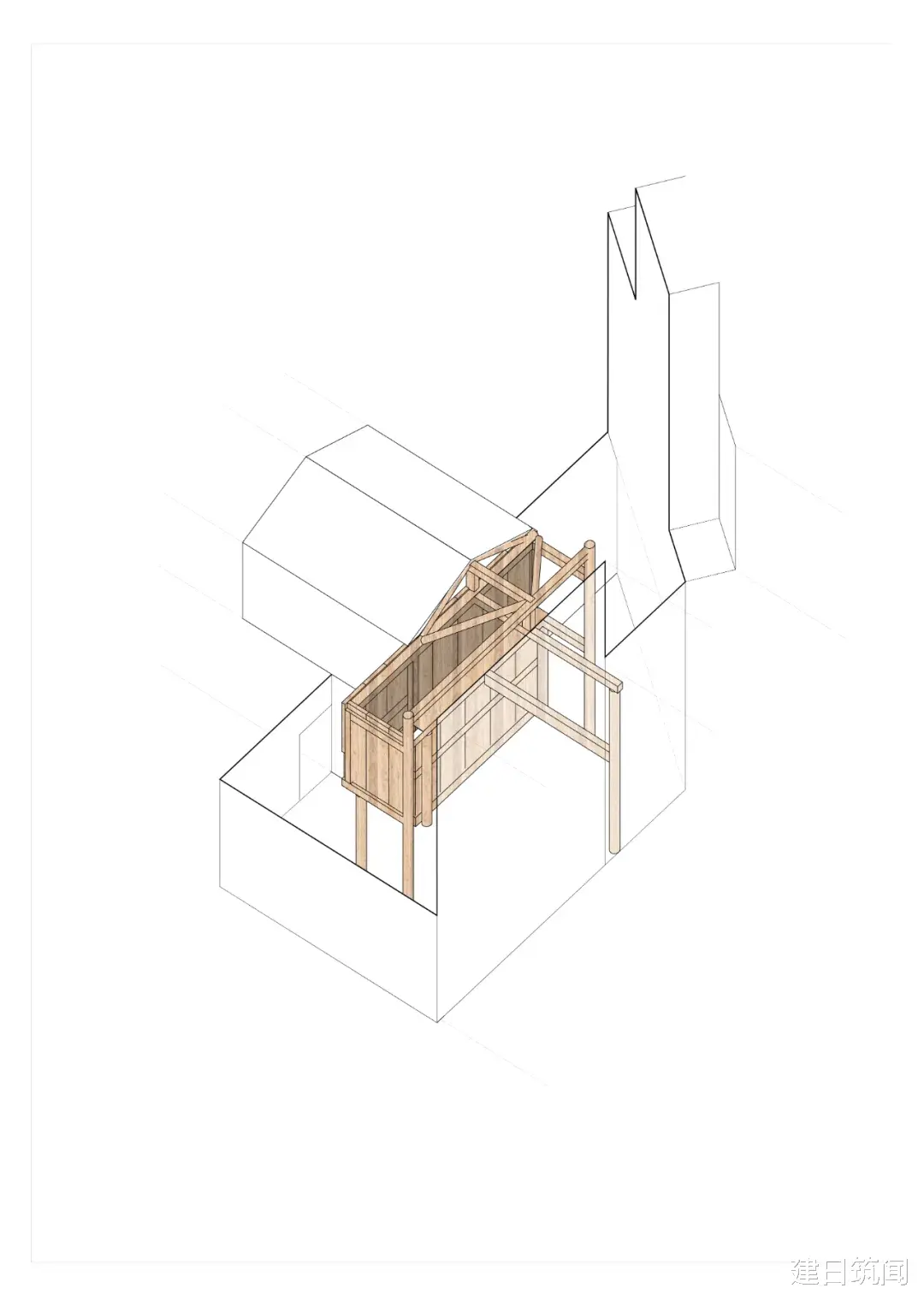 考虑到采光的问题,设计团队在设计初期便确定了在建筑北侧插入一个院子,院子的介入又可以让房子跟北侧的邻居保持一段距离。老郑原来的房子是一个祖上传统四合院部分空间的延伸,所以内部还保留着老四合院的木质结构,颇为有趣。但是如此一来,这房子跟边上的房子没有了清晰的结构边界。这正是老郑所不希望的。团队的初衷还是希望能尽量把原有的木结构保留住,既然无法将其吸收进建筑内部,那么让这些结构成为庭院的一部分也未尝不可。于是,院子的设计就是根据原先这个木结构来确定范围及走向,让这些结构残留能成为院子的一个记忆留存。项目从 2018 年开始,到了 2024 年才算真正的结束,整个 6 年的设计施工过程中这残落的木结构一直都还保留着。但是由于一直疏于对木结构的防护,最后一刻老郑以结构腐烂之名将其拆除,甚是可惜。